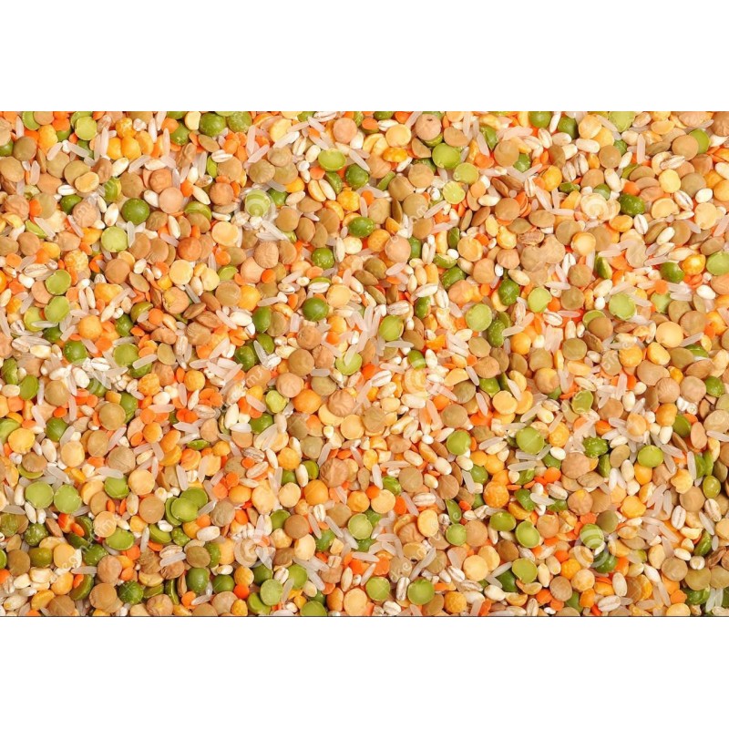 Composizione: lenticchia intera rossa, pisello spezzato, lenticchia rossa decorticata, fava spezzata e decorticata, riso.