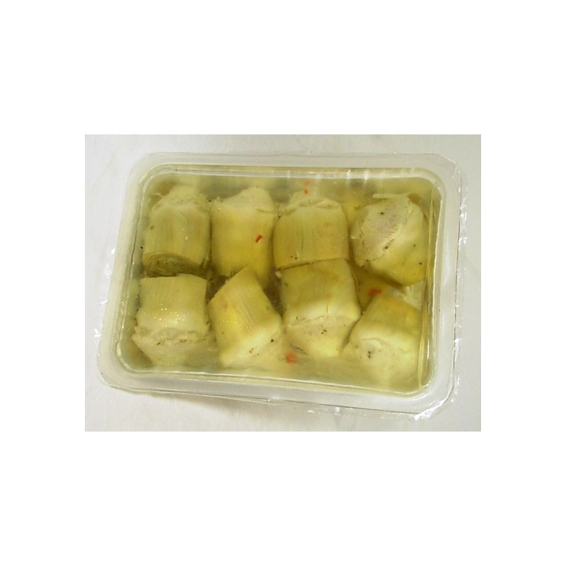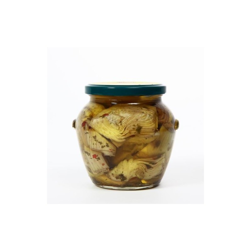 I nostri carciofi della varietà violetto spinoso – vengono raccolti, sbucciati a mano e immersi in una soluzione di acqua e limone. Successivamente vengono cotti in acqua e aceto.